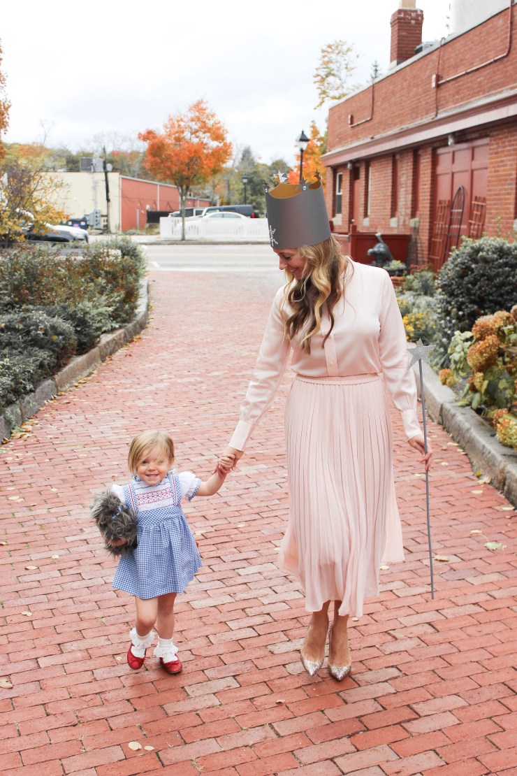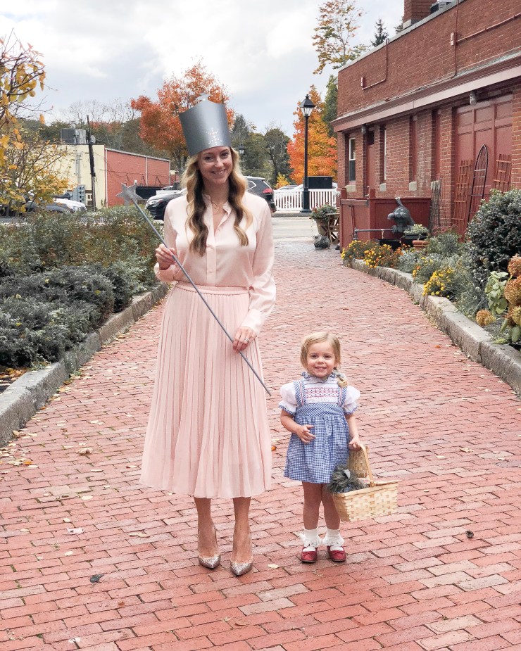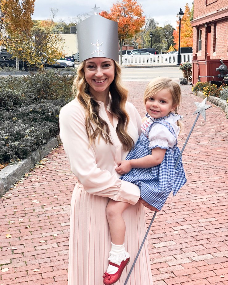 And then for me, I already owned the skirt (similar here and here), silk top, and sparkly shoes. A quick run to Michaels provided all the supplies for Glinda’s wand and crown!