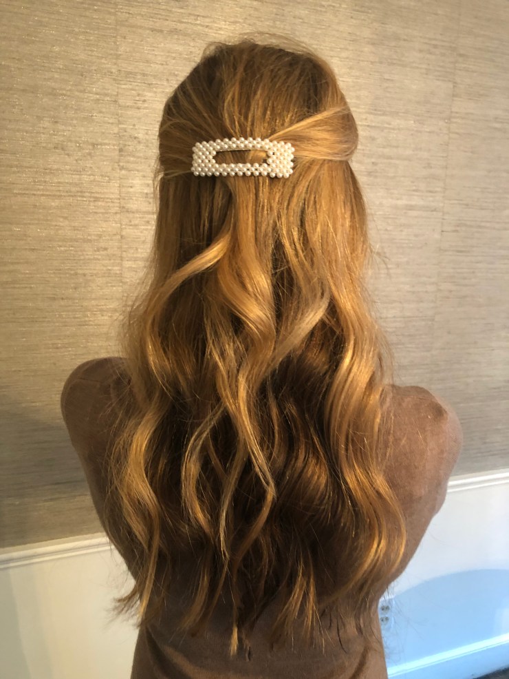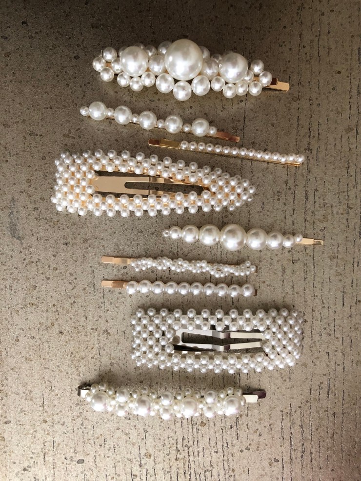 All barrettes are in style right now, but pearl and bejeweled are leading the trend. I think the pearl barrettes are so feminine and chic, so that’s what I went for! The above photo is made up of two sets: the four larger clips make one set for $10 (found HERE) and the five smaller ones are another set for $12 (found HERE). Can I get an “Amen!” for Amazon?? I like to mix and match the skinny ones in pairs or sets of three, while the largest ones make a statement all on their own. To note, some people are wearing many of the large ones at once, but I personally prefer a more minimal look.