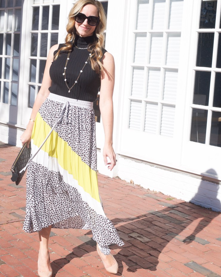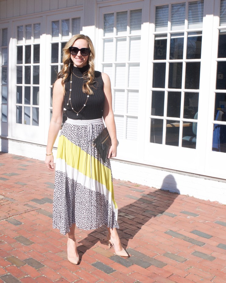 And lastly, a look that works for both the office or date night. Anyone who follows me knows I’m obsessed with pleated skirts and thankfully the trend is going strong! This printed one by Central Park West has both leopard and neon – yes, please! And it moves like a dream while you’re wearing it. The turtleneck shell is by 525 America and the necklaces and clutch are also from Ports & Company.