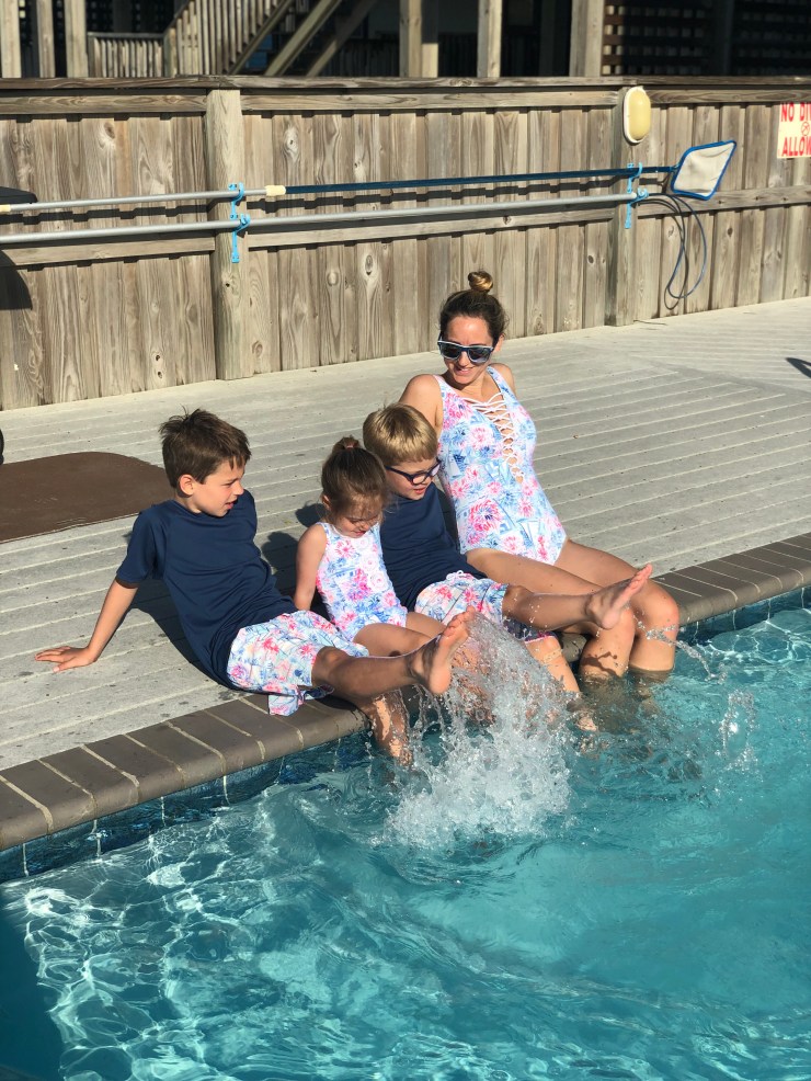 The details: the details on the women’s suit are so good! The little white knots down the front and back make it oh so chic. Pro tip: put the sunscreen on there before you pull the suit up – it’s hard to put on through that area once the suit is on! And the little girl’s suit has the beautiful Lilly crochet detail. The boys and men’s trunks are straightforward trunks with elastic waistbands, which my boys prefer. It’s a classic fit, very much like the VV Chappy trunks our family has worn for years.