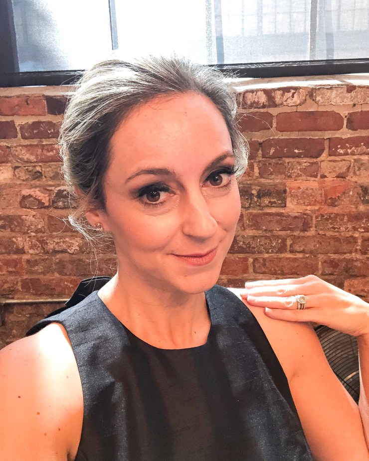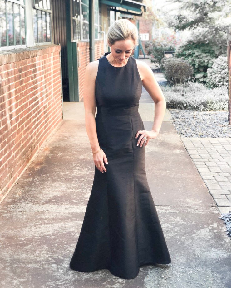 Other than the hem, the fit was spot on! The trumpet silhouette is so flattering on all body types. I looooooved the open back with the little bow detail. I knew I wanted to show that off, so opted for a slightly messy, low-bun hairstyle with simple stud earrings. And I kept the makeup classic but with lashes, because, duh.
