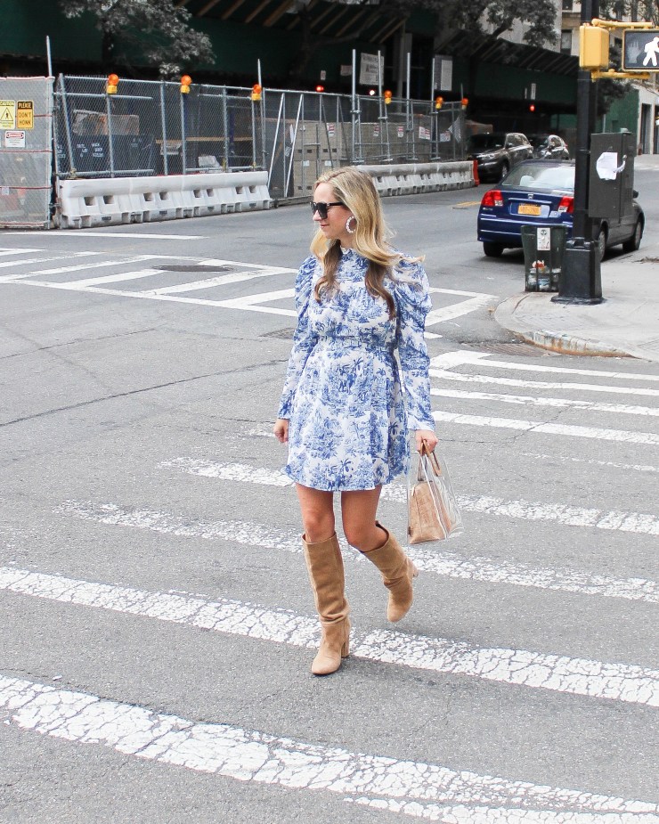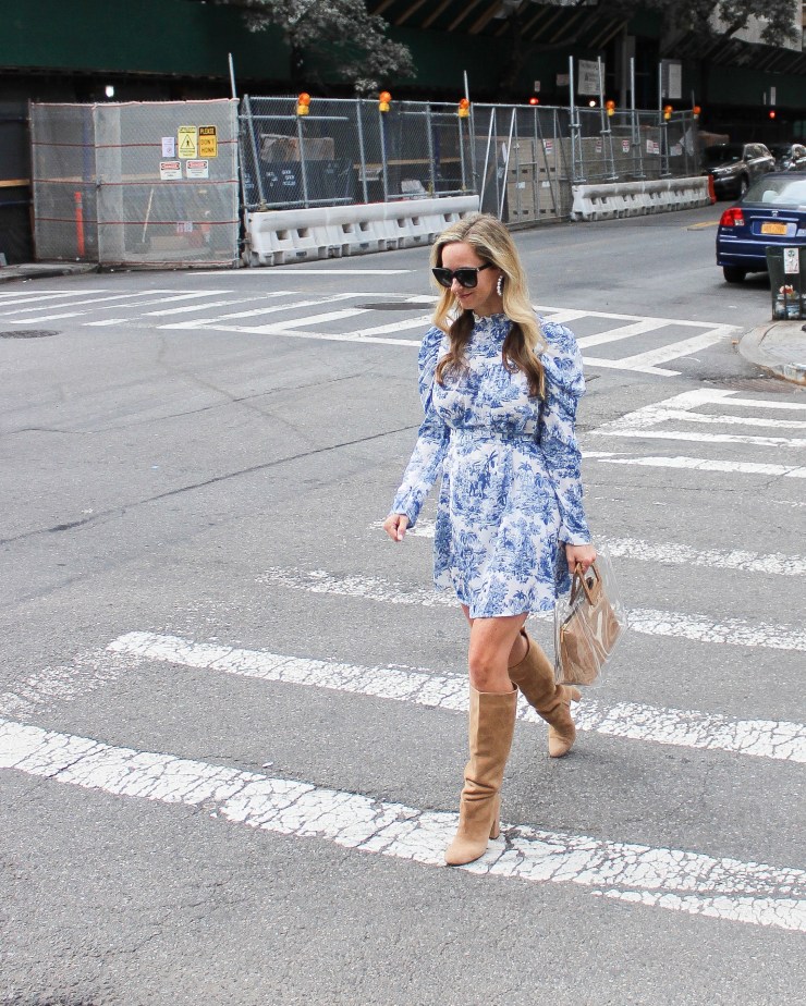 I am wearing a size Small. The fabric is thin. Perhaps a little sheer, but with the busy print, it’s not really noticeable. For $19, this seems expected. But the detail on the gathered shoulders and arms is super fun and feels expensive. I’m all about the puffy sleeves this season! It’s short, but styled with booties or boots makes it totally acceptable for the cooler fall and winter temps. I went with a neutral boot, but a pair of on-trend white booties would look so fab with it as well! And then fun sandals in the spring! It has a high neckline, which is a nice balance to the shorter length. The self-tie belt is detachable, so you can decide if you want the bow in the back or the front. I tied mine in the back to keep the front streamlined. The classic toile print is so fun, giving me old-fashioned wallpaper vibes in the best way.