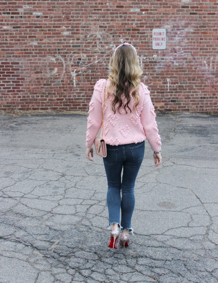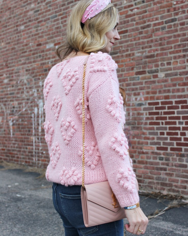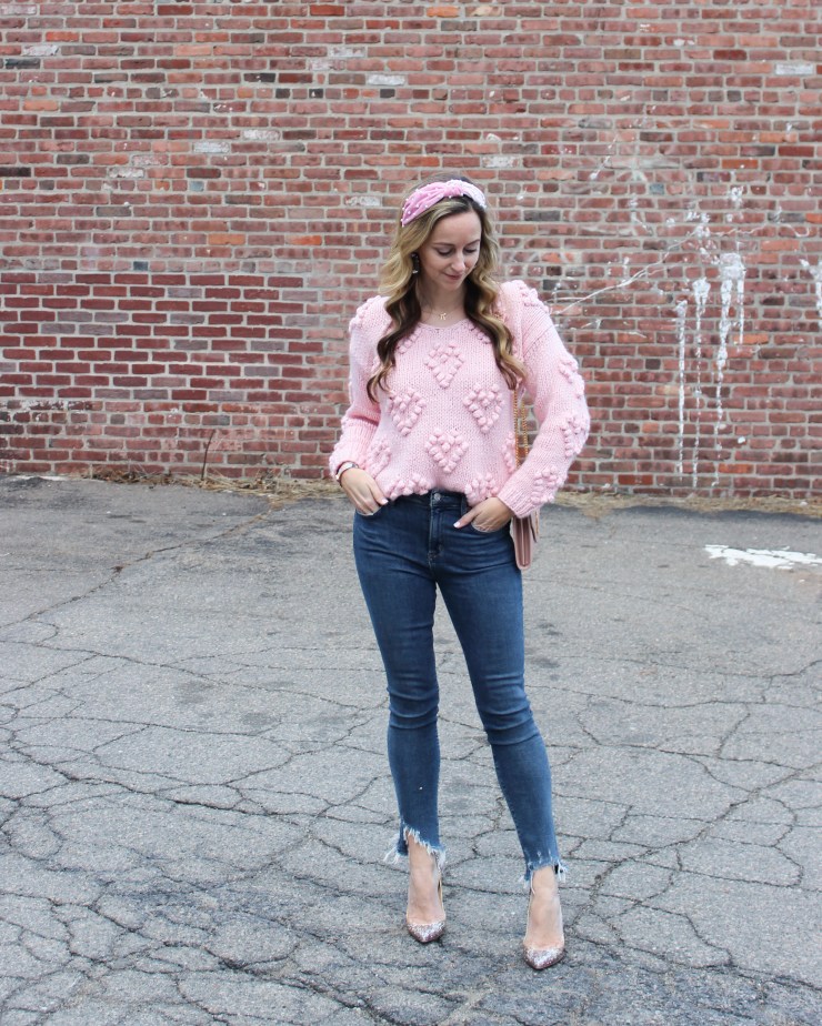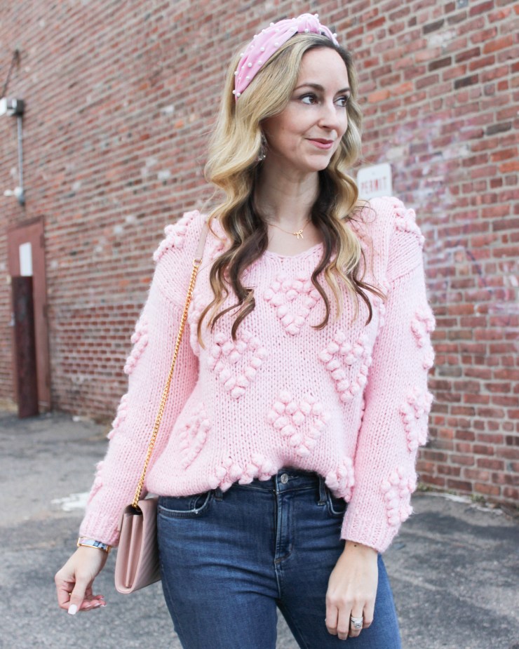 This sweater is perfect for Valentine’s Day. With jeans, heels and fun accessories you are ready for a night out. You can also dress it up further with a pretty maxi skirt or make it more casual with flats and a tote for daytime. I like the feminine neckline of the open v-neck silhouette. Another styling option is to order a size up, making it roomier to wear it off the shoulder. So pretty. It retails for just under $100, but currently on sale for $69.90!