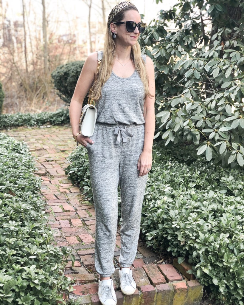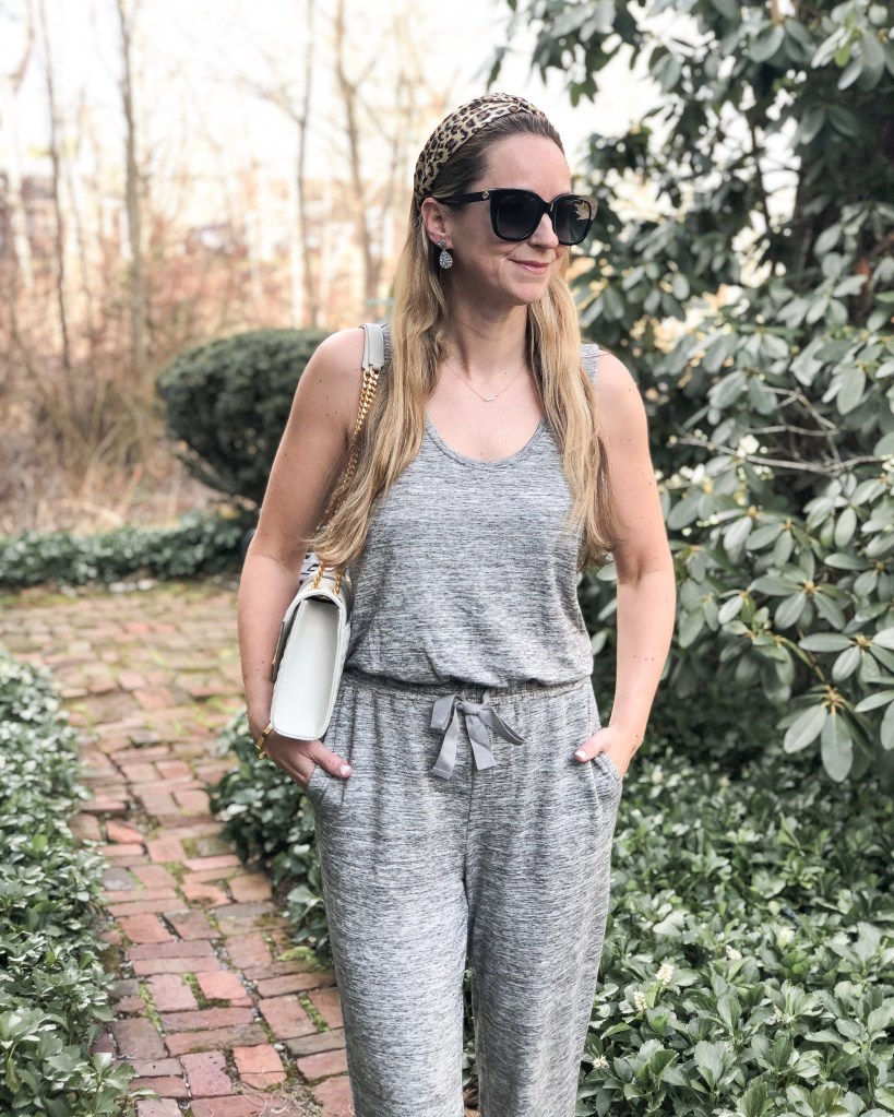 This knit material is so soft. It feels like pajamas. But the fact that it’s a jumpsuit makes you look pulled together. I quickly added a headband and handbag for my curbside take-out run.