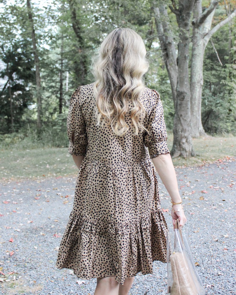 The tiers and little ruffle details are so good. The split neckline offers a feminine peek of skin without being revealing. A hint of puff sleeve makes the silhouette very on trend for fall. And finally, the skirt is nice and full – just look at that twirl!