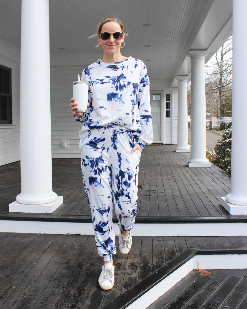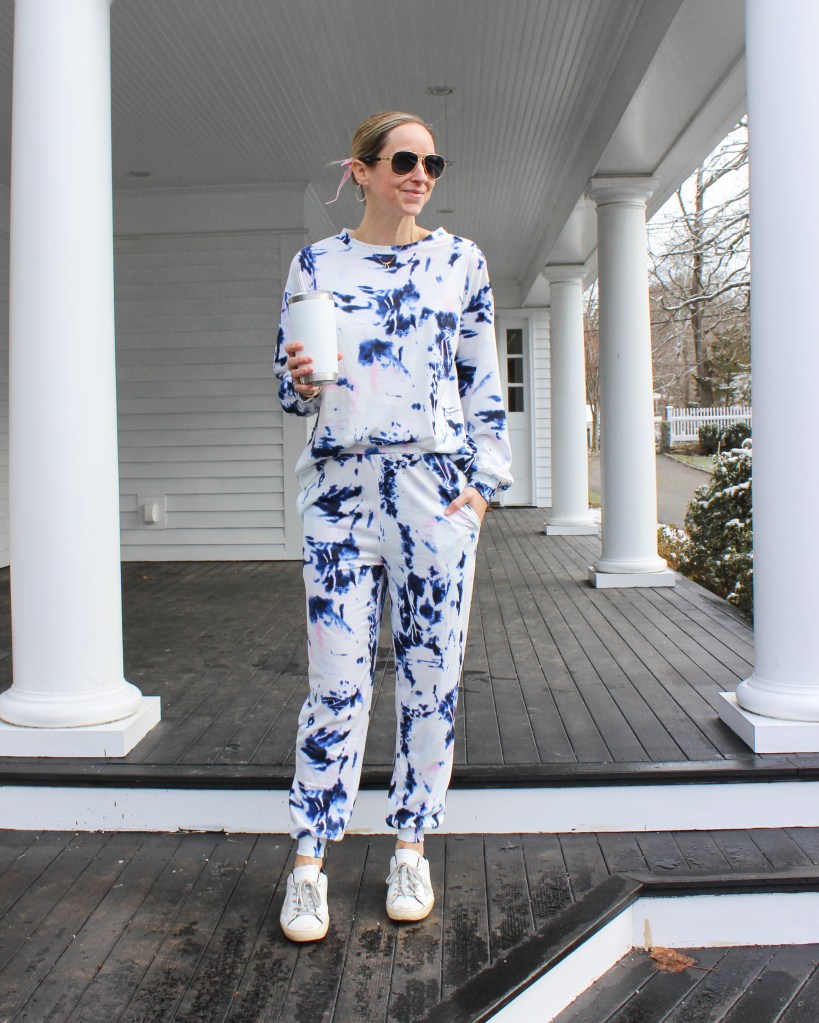 You can never have enough comfy clothes, and this tie dye set is my current fave. The colors are so pretty; I love the subtle soft pink against the bold navy. The cut is that of a sweatshirt and joggers, but the fabric is super lightweight and flowy.