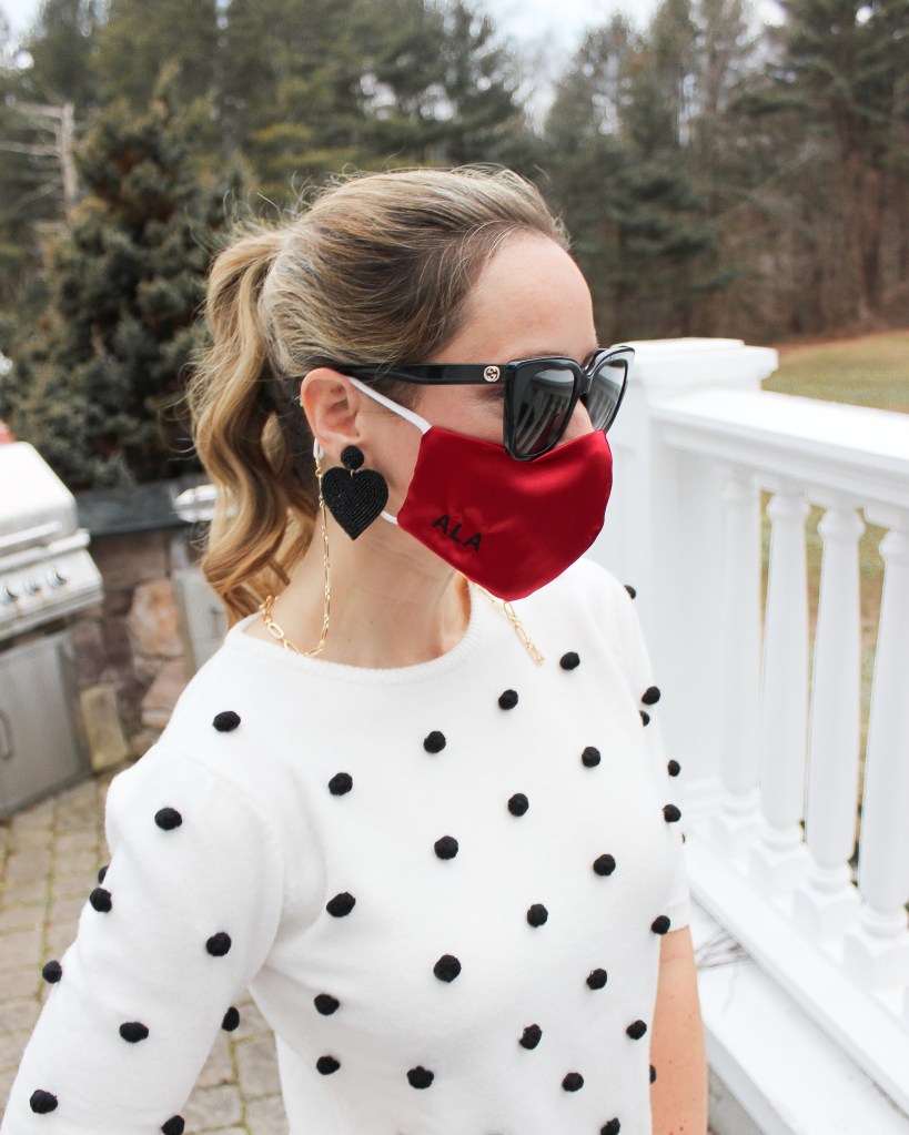 Next up: the accessories. You know I love BBMonogram, and she did not disappoint with her festive pieces. The red silk mask is SO luxurious and comfortable to wear! Add a monogram to make it one-of-a-kind. Such a good gift!