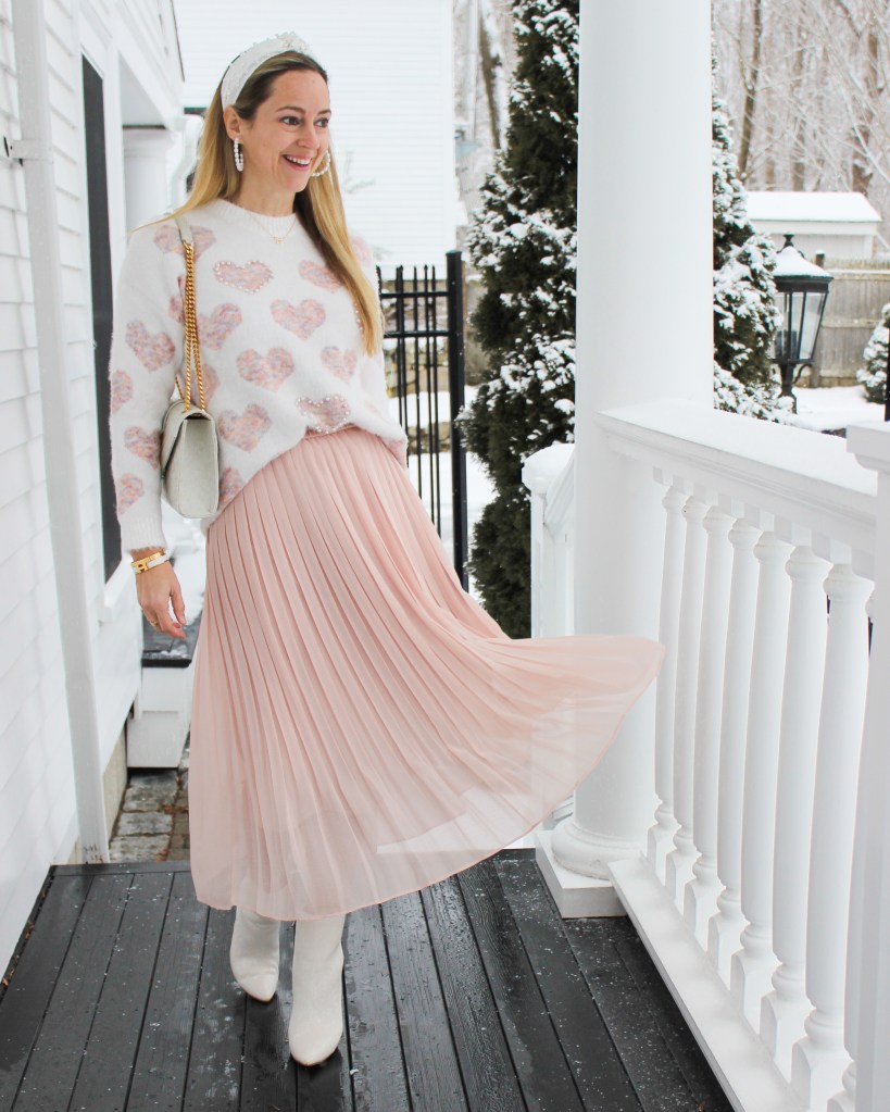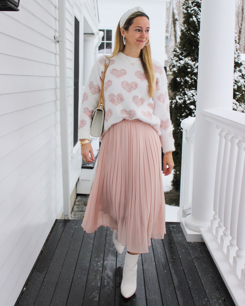 First up, this heart sweater with pearl details. This sweater is SO good. The colors are muted and beautiful and the little pearl details so special. I dressed this up with a midi skirt, boots and more pearls. But I’ve also worn it with jeans and Uggs – it does it all.