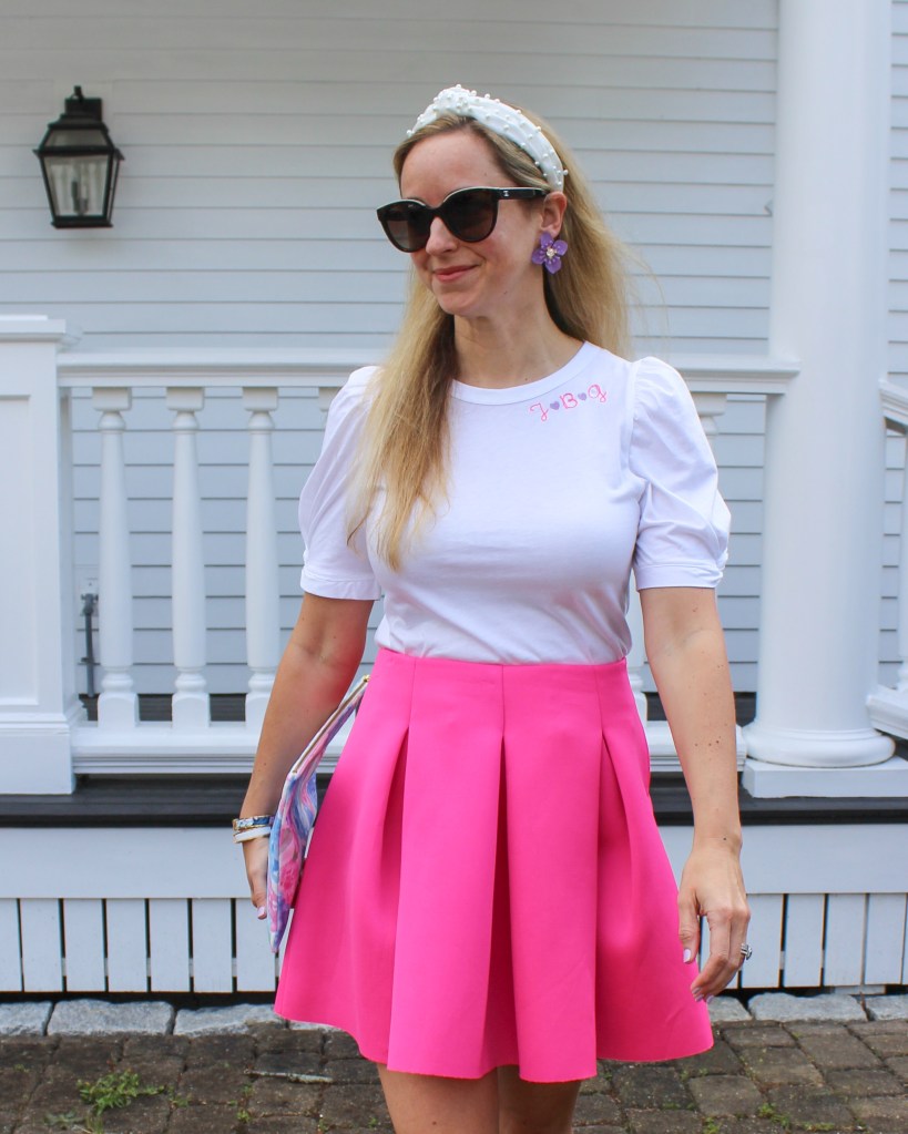 I dressed mine up for warm temps with a fun skirt and wedge heels. The pink initials and purple hearts are a great starting point to add some color.