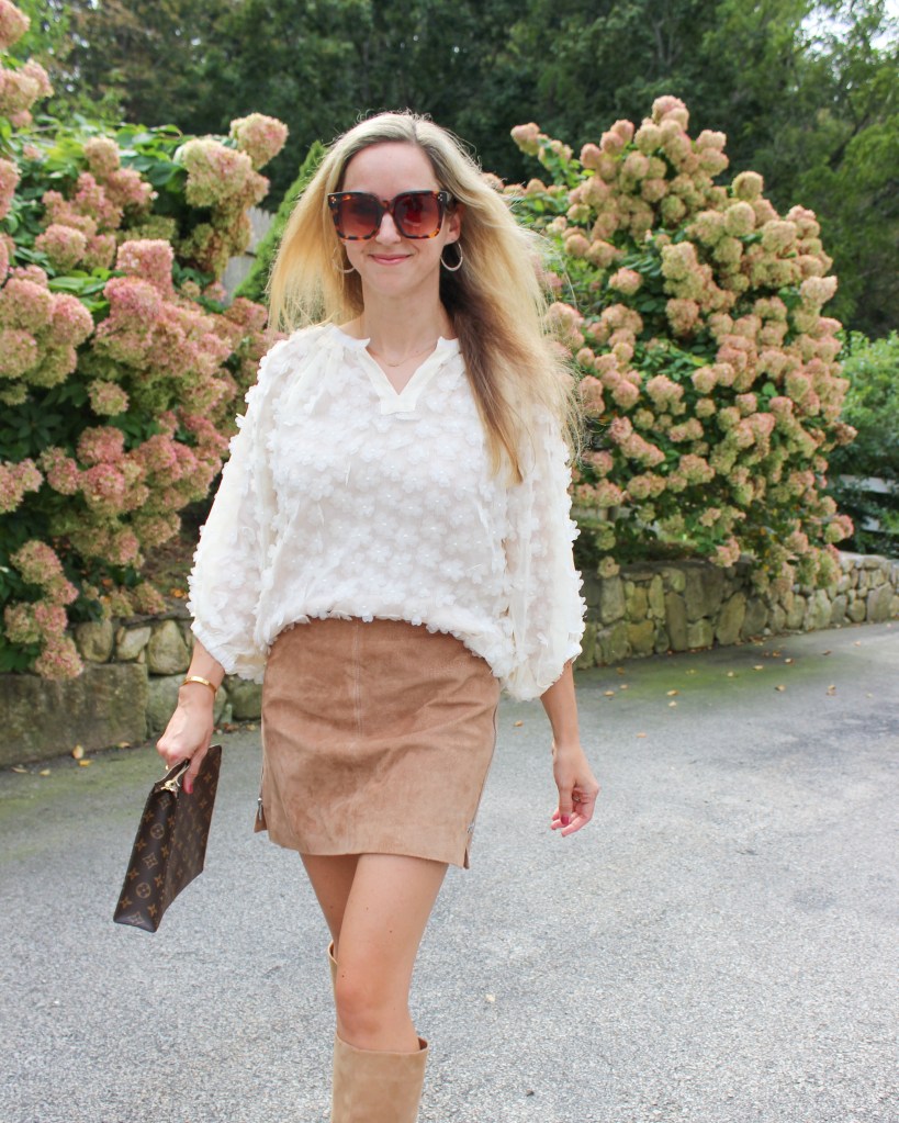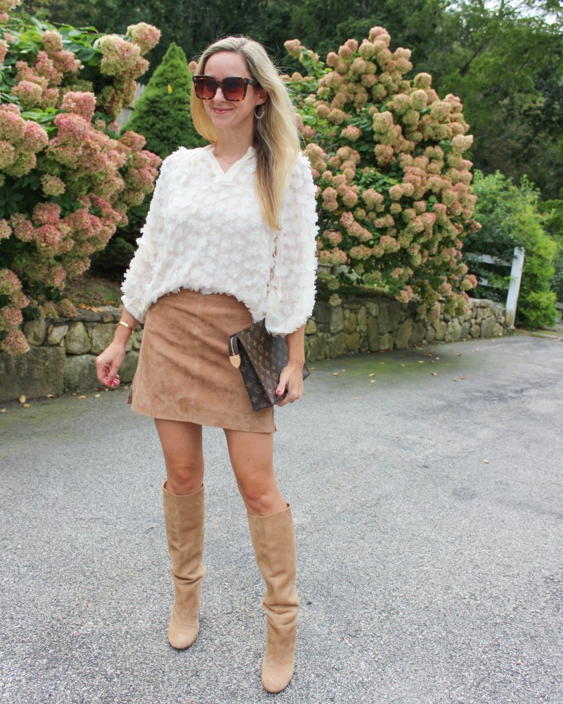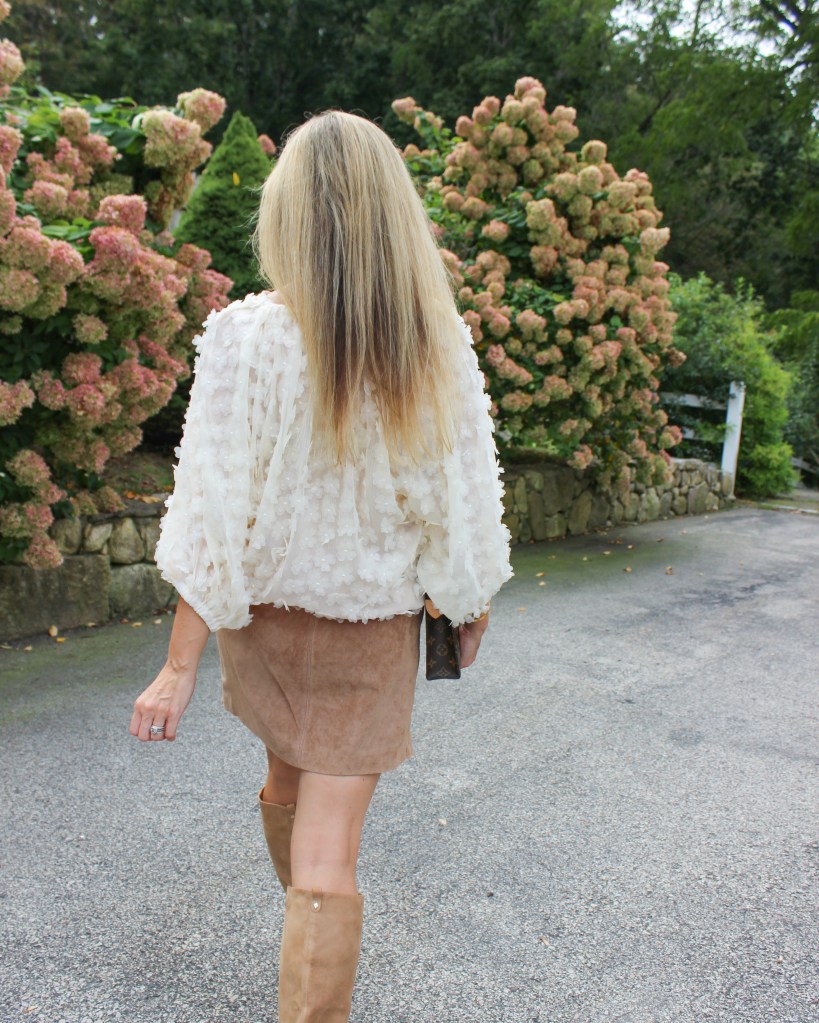 I styled it here with a suede skirt and boots. Perfect for a fall night out! The ivory color works beautifully with warm neutrals to embrace the season. To note, the top IS quite sheer. I paired it with a nude-colored cami so you see nothing under.
