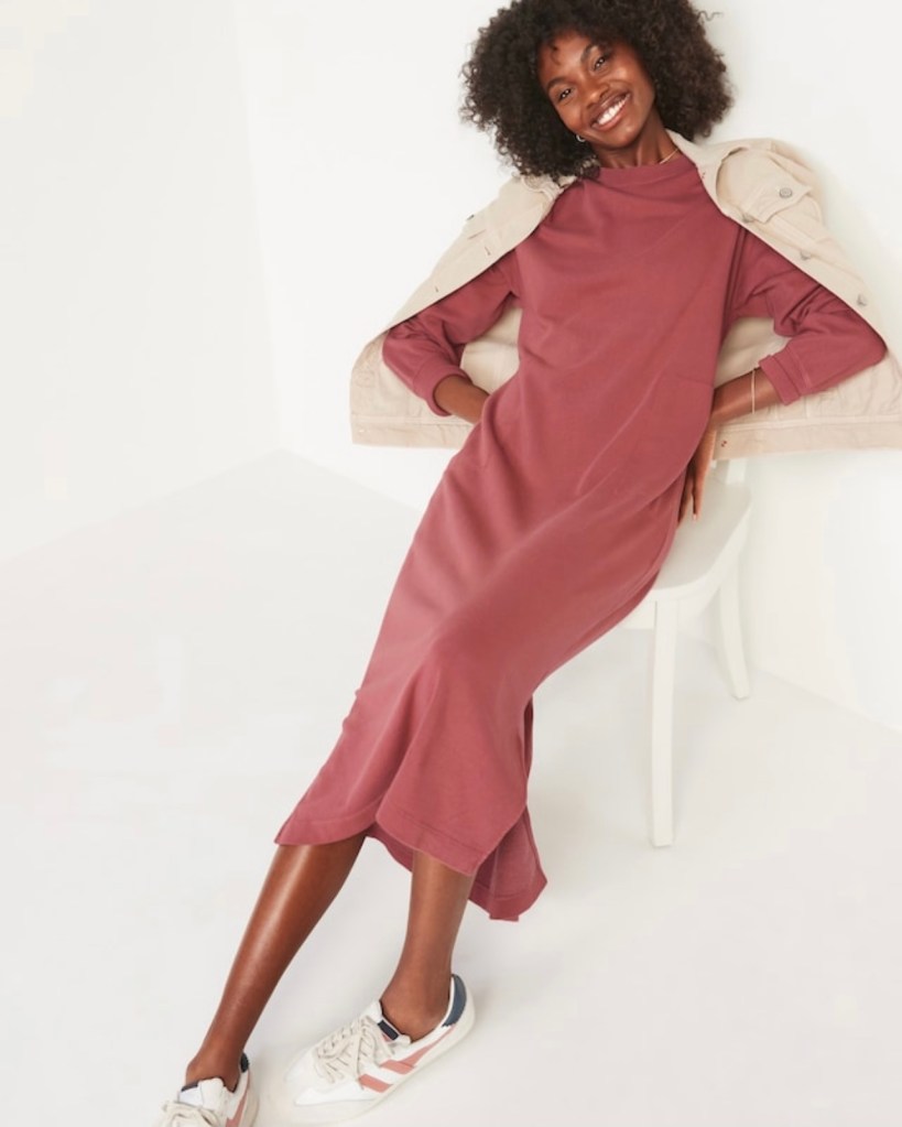 Fall cozy vibes – that’s what we want these days. And this sweatshirt dress is the epitome of that. The color is perfect for the season and it’s so comfortable that it feels like you’re in pajamas. And at $44.99, you’ll get an excellent cost-per-wear when you never want to take it off. (Yes, I measure something’s value in cost-per-wear. Try it!)
